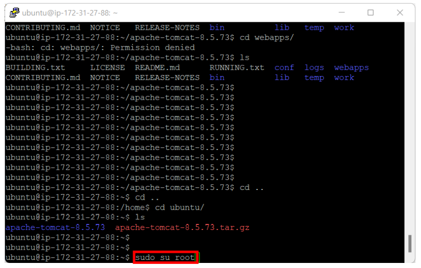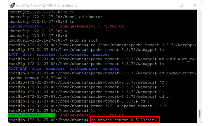 ② 톰캣 배포 폴더 접근 cd /home/ubuntu/apache-tomcat-8.5.73/webapps/
