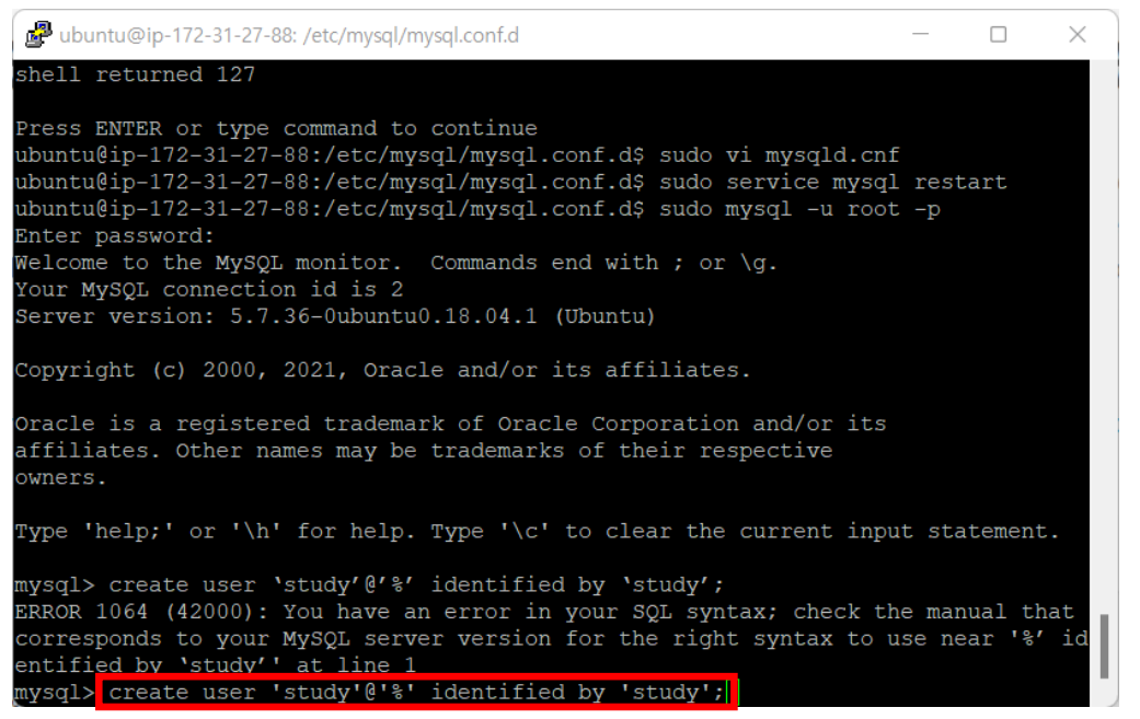 ① create user 'study'@'%' identified by 'study';